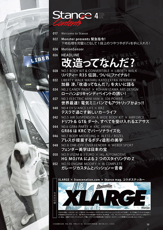 しかも、付録ステッカーはあのアメリカ西海外発祥のアパレルブランド「XLARGE」とStancenaiton.comとStance magazineのトリプルコラボが実現! カーカルチャーとアパレルが迎合するときなにかが起こる!?
