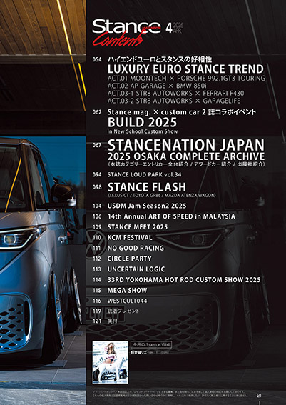 スタンス・マガジン#65 が約半年ぶりに発売! 今回のヘッドラインはカスタムの原点「改造ってなんだ?」について深堀りしていく。カバーカーは世界が認めるJDM「リバティーウォーク」のコンバーチブルR35が登場。その他にも全部で10パターンの改造ってなんだ?に言及していく。さらには11月に富士スピードウェイで開催されたスタンスネイションジャパン2025FUJIの特大リポート。本誌カテゴリーの全台紹介に加えて出展社やアワードカーの解説もついてくる。その他にも最新モディファイが入り込まれたユーロ特集や各地のイベントリポートなどをいれた内容凝縮版。