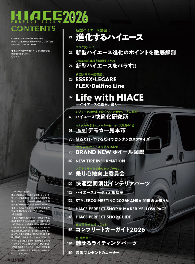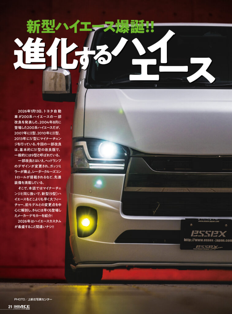 ハイエースパーフェクトブック2026(HPB2026)の表紙を飾るのは早くも登場した9型のエアロカスタム仕様。このエセックス・レガーレ仕様のハイエースの紹介を皮切りに、2026年の1月に一部改良が発表された200系ハイエースを徹底解剖。新型(9型)の進化ポイントの紹介に加え、フロントマスクをバラしてみた検証企画は必見だ!