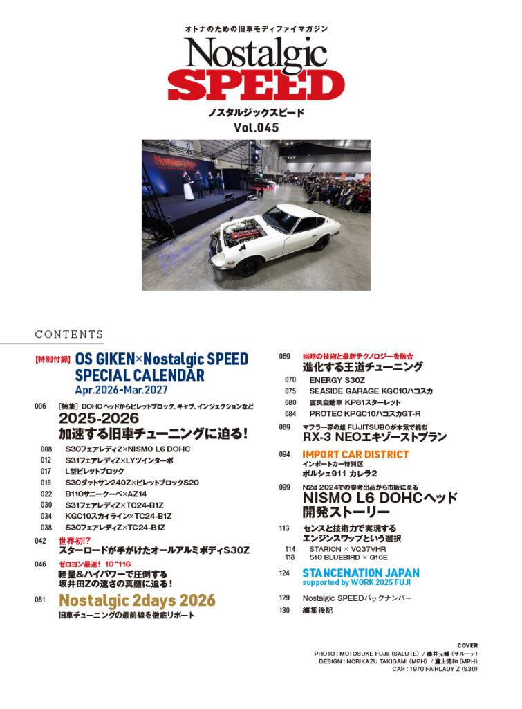 巻頭の特集は、2025-2026年の最新旧車チューンドを特集。話題のNISMO L型6気筒用 DOHCシリンダーヘッドを搭載したS30Zから、ビレット製のL型ブロック、LY型ツインターボ、左ハンドルのS30ZにビレットブロックのS20型フルチューンエンジンを搭載したダットサン「Z432」仕様、魔改造のAZ14型を搭載したB110サニーGX-5、OS技研のTC24を搭載しだ3台など、話題の旧車チューンドを大特集。